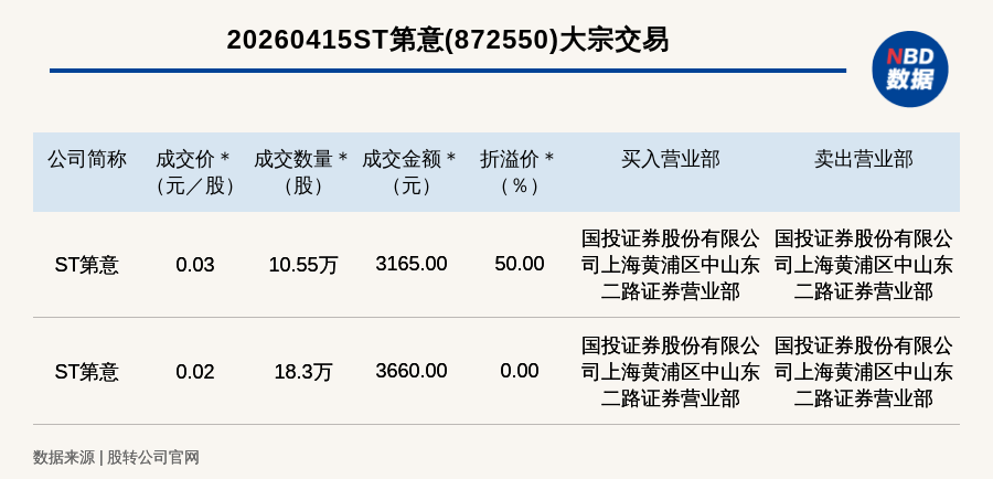 每经讯,2026年4月15日,新三板基础层公司ST第意(872550,收盘价:0.02元)发生2笔大宗交易,溢价率最高的一笔成交价0.03元/股,成交数量10.55万股,成交金额3165.00元,溢价50%。买入营业部是国投证券股份有限公司上海黄浦区中山东二路证券营业部,卖出营业部是国投证券股份有限公司上海黄浦区中山东二路证券营业部。