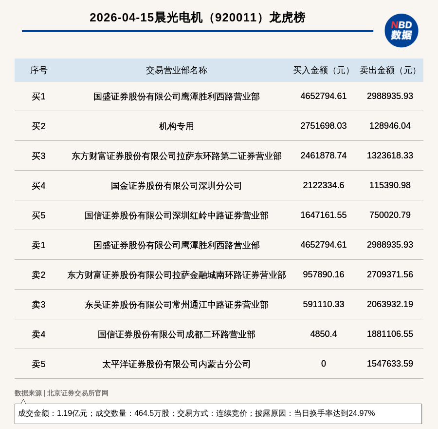 每经讯,2026年4月15日,北交所上市公司晨光电机(920011,收盘价:25.35元)登上龙虎榜,交易方式是连续竞价,披露原因是当日换手率达到24.97%,成交数量464.5万股,成交金额1.19亿元。买一席位为国盛证券股份有限公司鹰潭胜利西路营业部,买入465.28万元;卖一席位为国盛证券股份有限公司鹰潭胜利西路营业部,卖出298.89万元。
