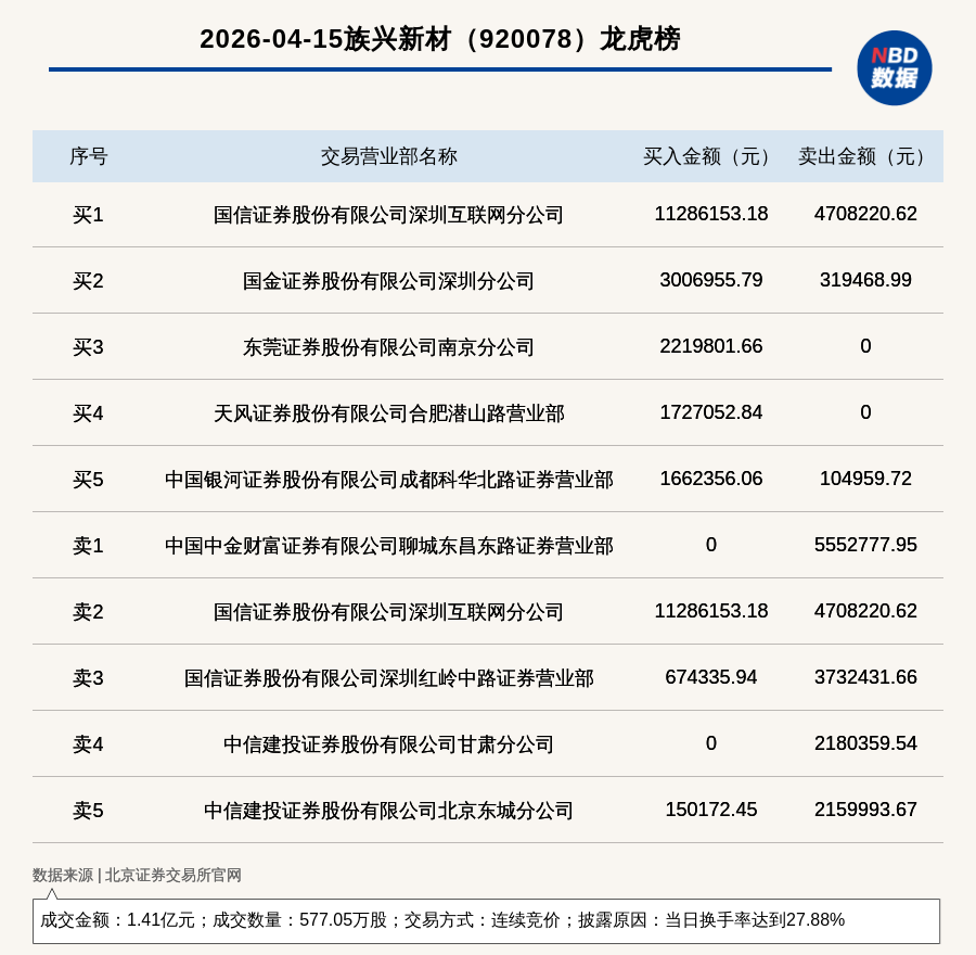 每经讯,2026年4月15日,北交所上市公司族兴新材(920078,收盘价:24.36元)登上龙虎榜,交易方式是连续竞价,披露原因是当日换手率达到27.88%,成交数量577.05万股,成交金额1.41亿元。买一席位为国信证券股份有限公司深圳互联网分公司,买入1128.62万元;卖一席位为中国中金财富证券有限公司聊城东昌东路证券营业部,卖出555.28万元。