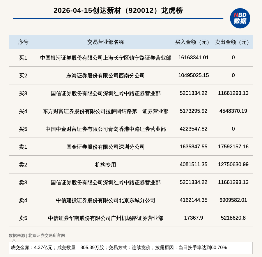 每经讯,2026年4月15日,北交所上市公司创达新材(920012,收盘价:51.88元)登上龙虎榜,交易方式是连续竞价,披露原因是当日换手率达到60.70%,成交数量805.39万股,成交金额4.37亿元。买一席位为中国银河证券股份有限公司上海长宁区镇宁路证券营业部,买入1616.33万元;卖一席位为国金证券股份有限公司深圳分公司,卖出1759.22万元。