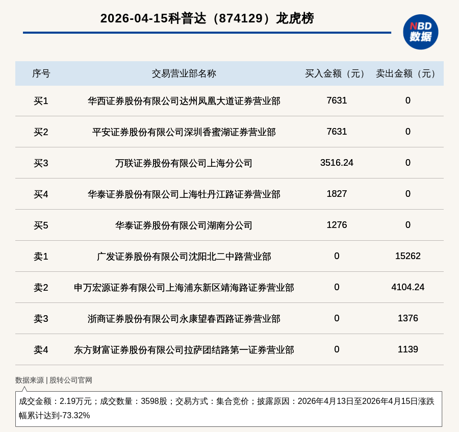 每经讯,2026年4月15日,新三板创新层公司科普达(874129,收盘价:5.87元)登上龙虎榜,交易方式是集合竞价,披露原因是2026年4月13日至2026年4月15日涨跌幅累计达到-73.32%,成交数量3598股,成交金额2.19万元。买一席位为华西证券股份有限公司达州凤凰大道证券营业部,买入7631元;卖一席位为广发证券股份有限公司沈阳北二中路营业部,卖出1.53万元。