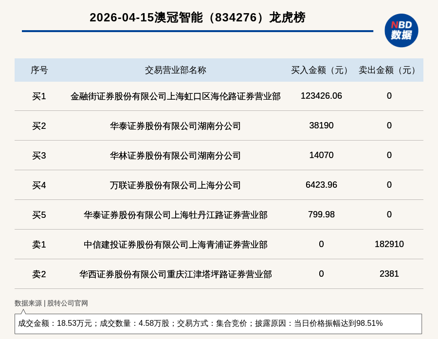 每经讯,2026年4月15日,新三板创新层公司澳冠智能(834276,收盘价:7.95元)登上龙虎榜,交易方式是集合竞价,披露原因是当日价格振幅达到98.51%,成交数量4.58万股,成交金额18.53万元。买一席位为金融街证券股份有限公司上海虹口区海伦路证券营业部,买入12.34万元;卖一席位为中信建投证券股份有限公司上海青浦证券营业部,卖出18.29万元。