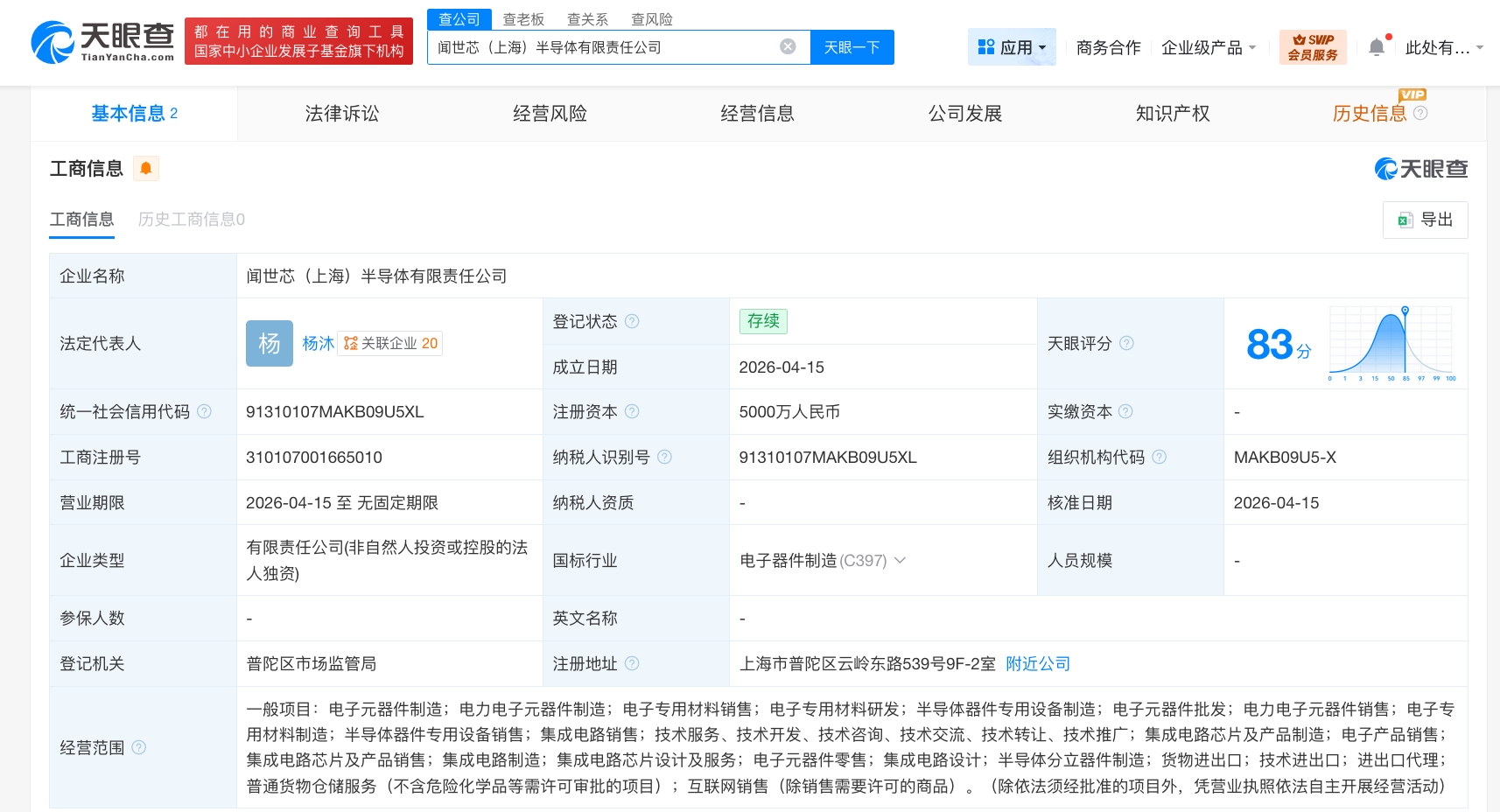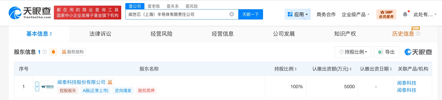 每经AI快讯,天眼查工商信息显示,近日,闻世芯(上海)半导体有限责任公司成立,法定代表人为杨沐,注册资本5000万元人民币,经营范围含电子元器件制造、电力电子元器件制造、半导体器件专用设备制造、集成电路销售、集成电路芯片及产品制造等。股东信息显示,该公司由闻泰科技(600745)全资持股。
