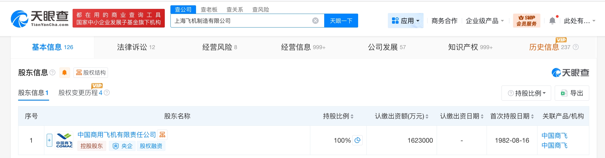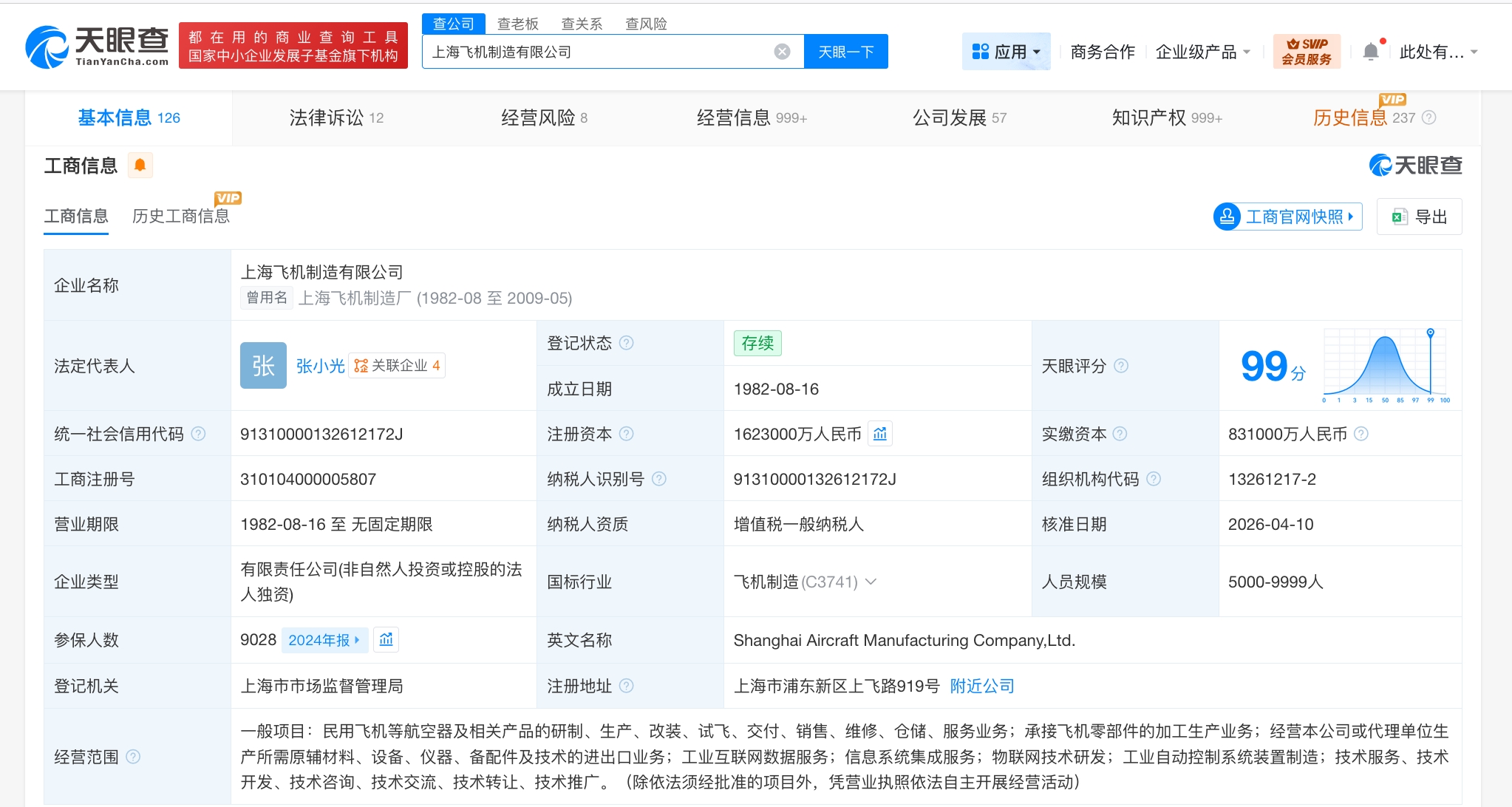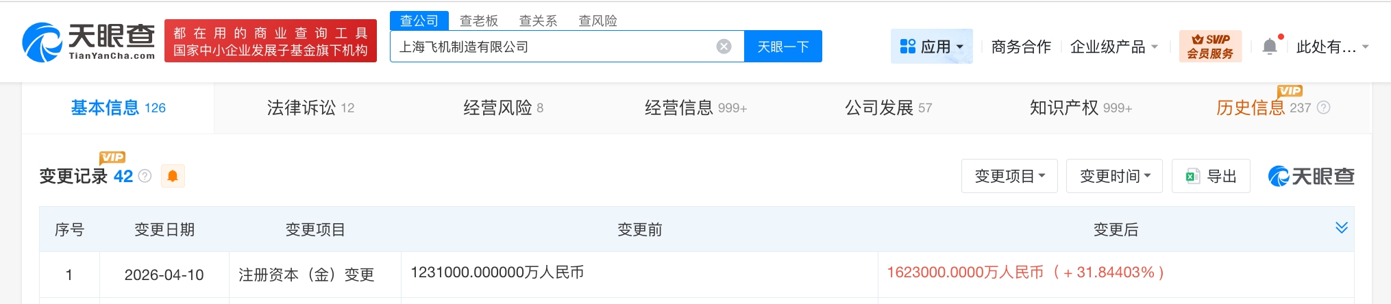 每经AI快讯,天眼查App显示,近日,上海飞机制造有限公司发生工商变更,注册资本由123.1亿元人民币增至162.3亿元人民币,增幅约32%。该公司成立于1982年8月,法定代表人为张小光,经营范围含民用飞机等航空器及相关产品的研制、生产、改装、试飞、交付、销售、维修、仓储、服务业务,承接飞机零部件的加工生产业务等,由中国商用飞机有限责任公司全资持股。