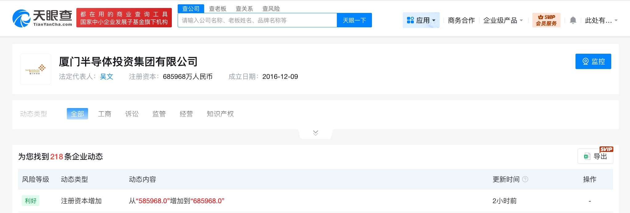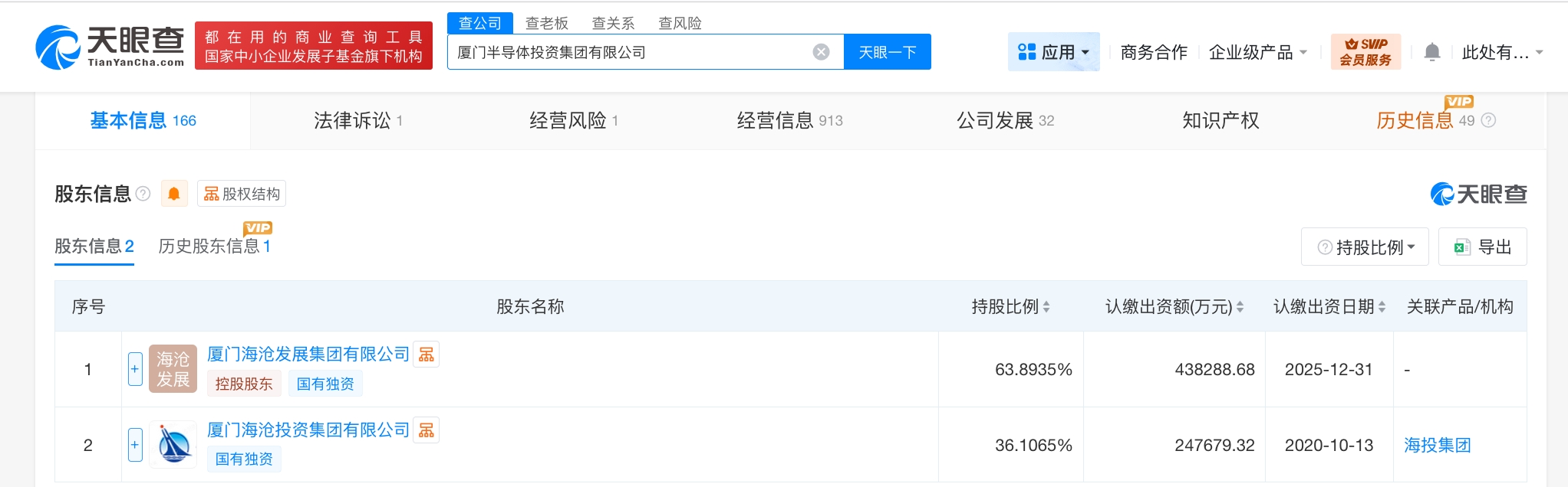 每经AI快讯,天眼查App显示,近日,厦门半导体投资集团有限公司发生工商变更,注册资本由约58.6亿元人民币增至约68.6亿元人民币,增幅约17%。该公司成立于2016年12月,法定代表人为吴文,经营范围为以自有资金从事投资活动、自有资金投资的资产管理服务、半导体分立器件制造、工程和技术研究和试验发展、技术推广服务,由厦门海沧发展集团有限公司、厦门海沧投资集团有限公司共同持股。