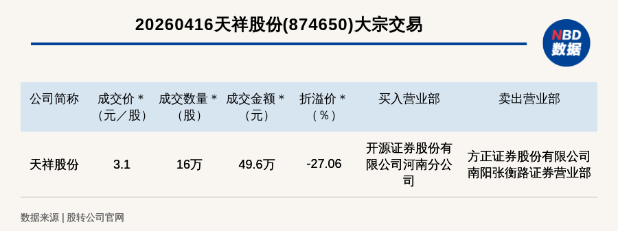 每经讯,2026年4月16日,新三板基础层公司天祥股份(874650,收盘价:4.25元)发生一笔大宗交易,成交价3.1元/股,成交数量16万股,成交金额49.6万元,折价27.06%。买入营业部是开源证券股份有限公司河南分公司,卖出营业部是方正证券股份有限公司南阳张衡路证券营业部。