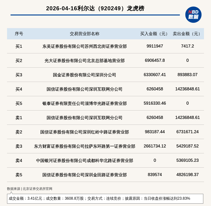 每经讯,2026年4月16日,北交所上市公司利尔达(920249,收盘价:9.77元)登上龙虎榜,交易方式是连续竞价,披露原因是当日收盘价涨幅达到23.83%,成交数量3608.8万股,成交金额3.41亿元。买一席位为东吴证券股份有限公司苏州西北街证券营业部,买入991.19万元;卖一席位为国信证券股份有限公司深圳互联网分公司,卖出1423.68万元。