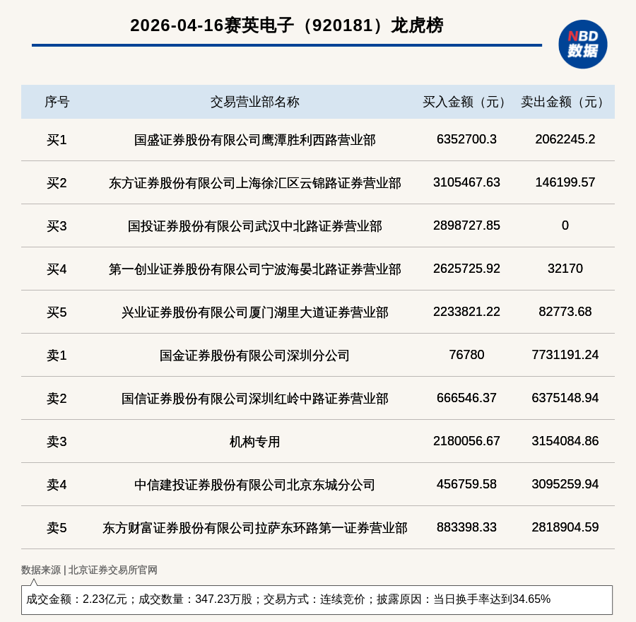 每经讯,2026年4月16日,北交所上市公司赛英电子(920181,收盘价:64.49元)登上龙虎榜,交易方式是连续竞价,披露原因是当日换手率达到34.65%,成交数量347.23万股,成交金额2.23亿元。买一席位为国盛证券股份有限公司鹰潭胜利西路营业部,买入635.27万元;卖一席位为国金证券股份有限公司深圳分公司,卖出773.12万元。