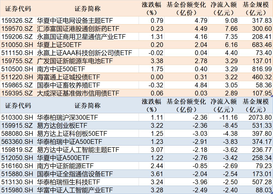 与此同时,华泰柏瑞沪深300ETF基金份额减少2.36亿份,净流出额11.16亿元;易方达创业板ETF基金份额减少2.36亿份,净流出额8.45亿元;易方达上证科创板50ETF基金份额减少3.03亿份,净流出额4.38亿元。