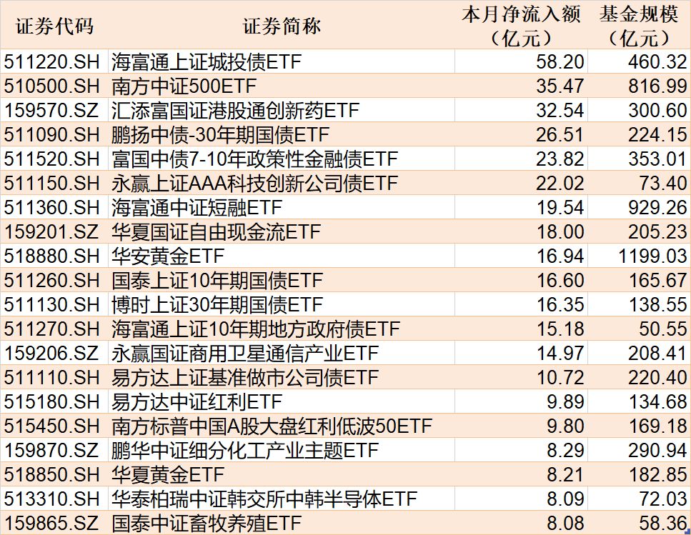 截至4月16日,本月资金净流入额居前20的ETF名单如下: