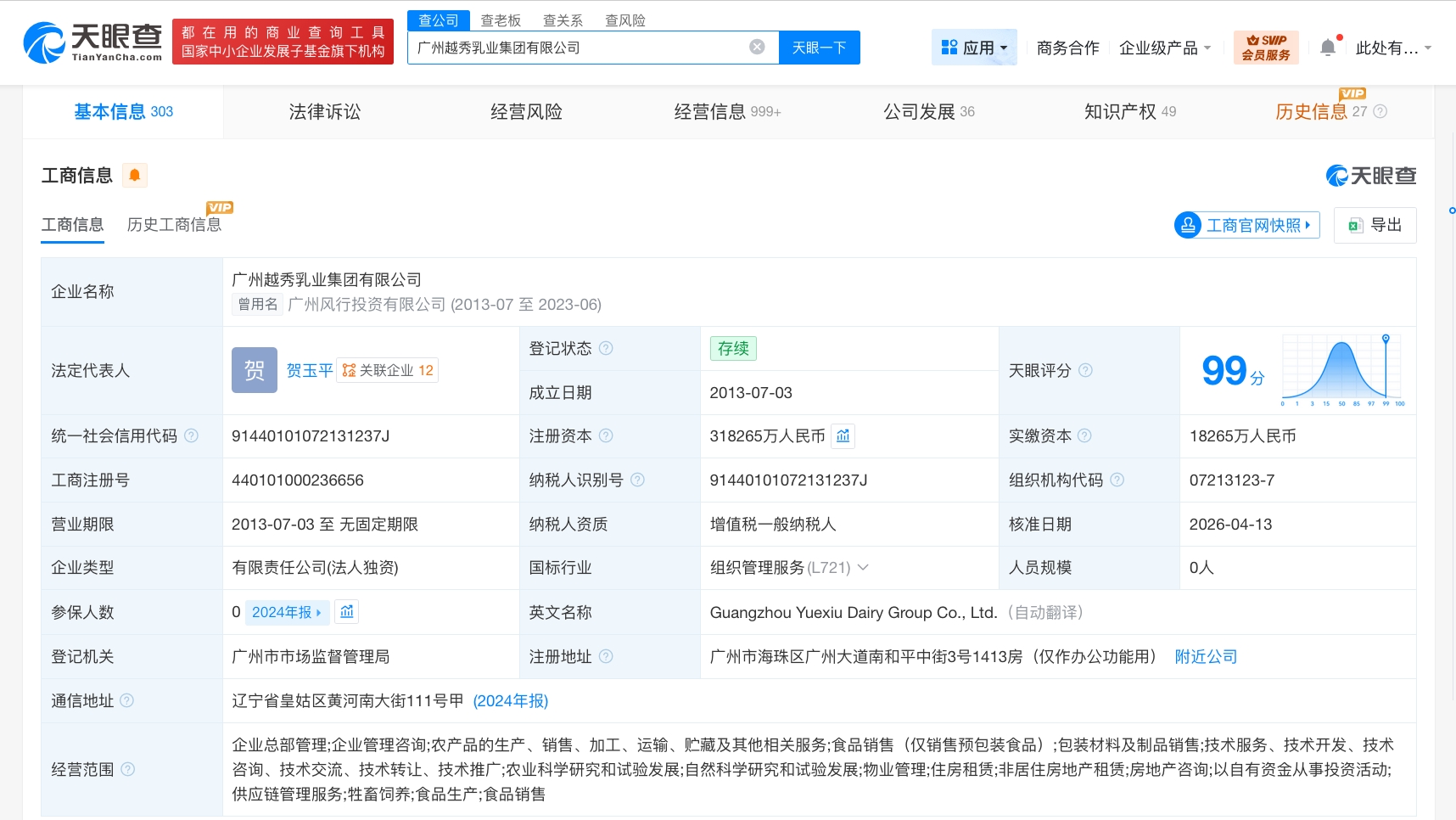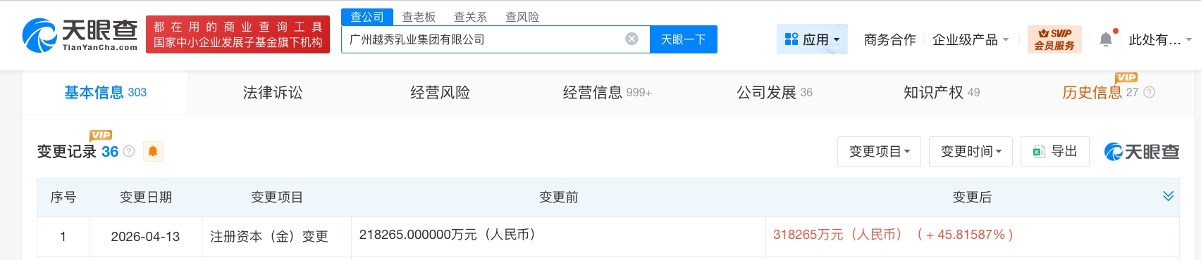 每经AI快讯,天眼查App显示,近日,广州越秀乳业集团有限公司发生工商变更,注册资本由约21.8亿元人民币增至约31.8亿元人民币,增幅约46%。该公司成立于2013年7月,法定代表人为贺玉平,经营范围含企业总部管理,企业管理咨询;农产品的生产、销售、加工、运输、贮藏及其他相关服务等。股东信息显示,该公司由广州越秀食品有限公司全资持股。
