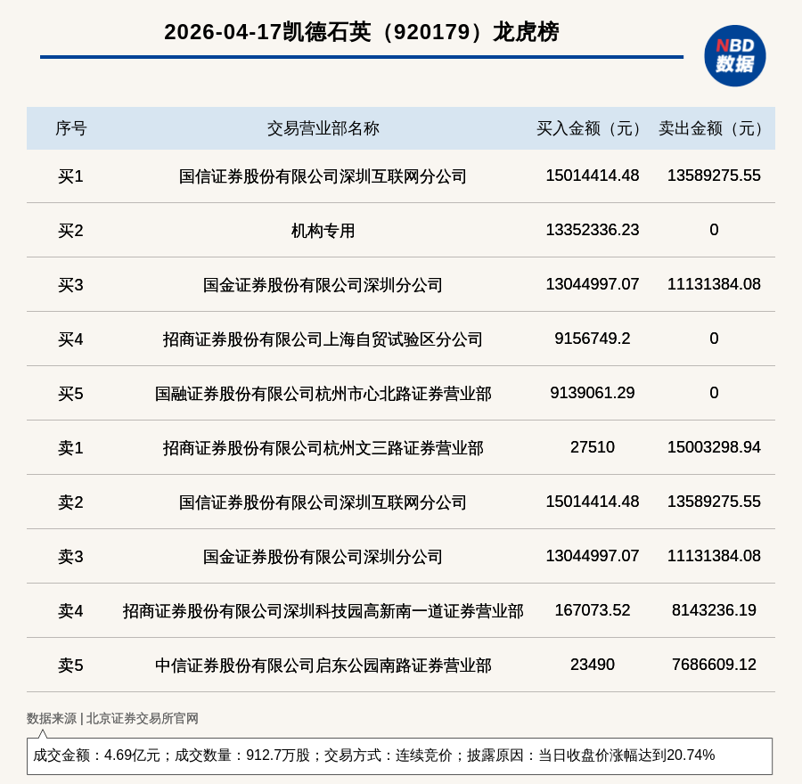 每经讯,2026年4月17日,北交所上市公司凯德石英(920179,收盘价:54.2元)登上龙虎榜,交易方式是连续竞价,披露原因是当日收盘价涨幅达到20.74%,成交数量912.7万股,成交金额4.69亿元。买一席位为国信证券股份有限公司深圳互联网分公司,买入1501.44万元;卖一席位为招商证券股份有限公司杭州文三路证券营业部,卖出1500.33万元。