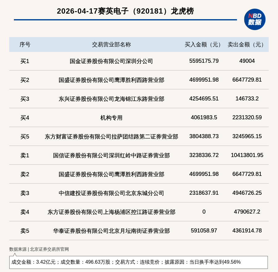 每经讯,2026年4月17日,北交所上市公司赛英电子(920181,收盘价:73.97元)登上龙虎榜,交易方式是连续竞价,披露原因是当日换手率达到49.56%,成交数量496.63万股,成交金额3.42亿元。买一席位为国金证券股份有限公司深圳分公司,买入559.52万元;卖一席位为国信证券股份有限公司深圳红岭中路证券营业部,卖出1041.38万元。