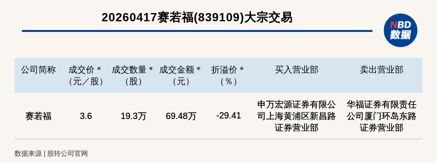 每经讯,2026年4月17日,新三板基础层公司赛若福(839109,收盘价:5.1元)发生一笔大宗交易,成交价3.6元/股,成交数量19.3万股,成交金额69.48万元,折价29.41%。买入营业部是申万宏源证券有限公司上海黄浦区新昌路证券营业部,卖出营业部是华福证券有限责任公司厦门环岛东路证券营业部。