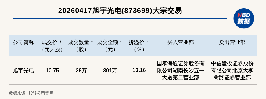 每经讯,2026年4月17日,新三板创新层公司旭宇光电(873699,收盘价:9.5元)发生一笔大宗交易,成交价10.75元/股,成交数量28万股,成交金额301万元,溢价13.16%。买入营业部是国泰海通证券股份有限公司湖南长沙五一大道第二营业部,卖出营业部是中信建投证券股份有限公司北京大柳树路证券营业部。