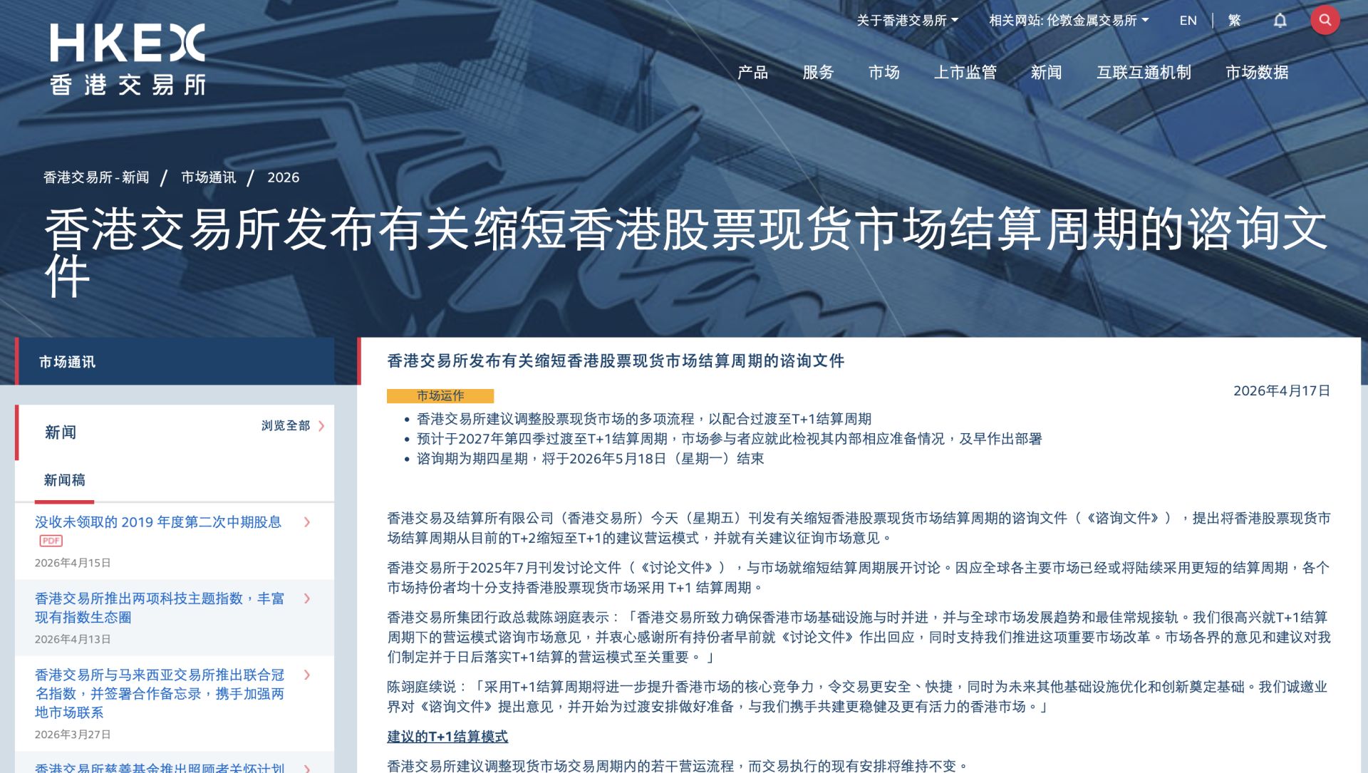 港交所行政总裁陈翊庭表示:“采用T+1结算周期将进一步提升香港市场的核心竞争力,令交易更安全、快捷,同时为未来其他基础设施优化和创新奠定基础。我们诚邀业界对咨询文件提出意见,并开始为过渡安排做好准备,与我们携手共建更稳健及更有活力的香港市场。”