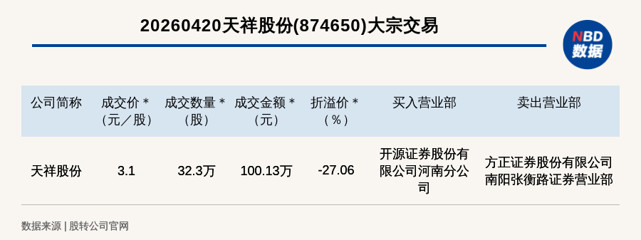 每经讯,2026年4月20日,新三板基础层公司天祥股份(874650,收盘价:4.25元)发生一笔大宗交易,成交价3.1元/股,成交数量32.3万股,成交金额100.13万元,折价27.06%。买入营业部是开源证券股份有限公司河南分公司,卖出营业部是方正证券股份有限公司南阳张衡路证券营业部。