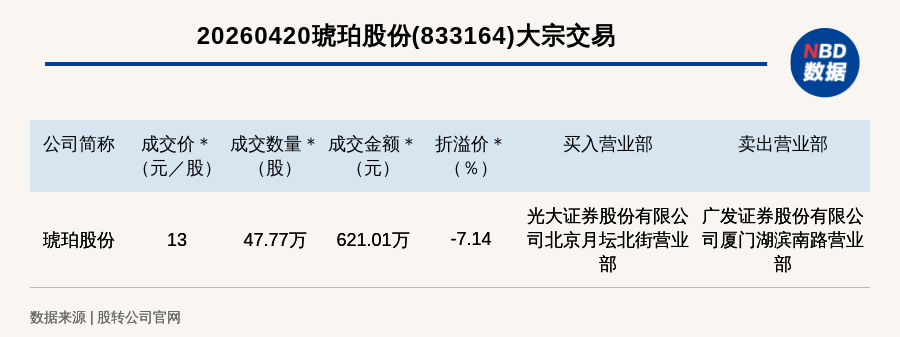 每经讯,2026年4月20日,新三板基础层公司琥珀股份(833164,收盘价:14元)发生一笔大宗交易,成交价13元/股,成交数量47.77万股,成交金额621.01万元,折价7.14%。买入营业部是光大证券股份有限公司北京月坛北街营业部,卖出营业部是广发证券股份有限公司厦门湖滨南路营业部。