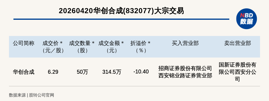 每经讯,2026年4月20日,新三板创新层公司华创合成(832077,收盘价:7.02元)发生一笔大宗交易,成交价6.29元/股,成交数量50万股,成交金额314.5万元,折价10.4%。买入营业部是招商证券股份有限公司西安锦业路证券营业部,卖出营业部是国新证券股份有限公司西安分公司。