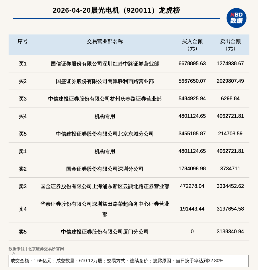 每经讯,2026年4月20日,北交所上市公司晨光电机(920011,收盘价:26.74元)登上龙虎榜,交易方式是连续竞价,披露原因是当日换手率达到32.80%,成交数量610.12万股,成交金额1.65亿元。买一席位为国信证券股份有限公司深圳红岭中路证券营业部,买入667.89万元;卖一席位为机构专用,卖出406.27万元。