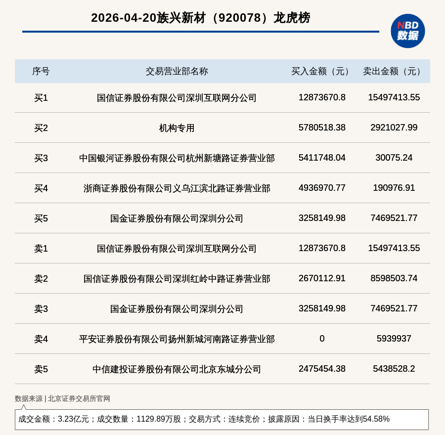 每经讯,2026年4月20日,北交所上市公司族兴新材(920078,收盘价:28.06元)登上龙虎榜,交易方式是连续竞价,披露原因是当日换手率达到54.58%,成交数量1129.89万股,成交金额3.23亿元。买一席位为国信证券股份有限公司深圳互联网分公司,买入1287.37万元;卖一席位为国信证券股份有限公司深圳互联网分公司,卖出1549.74万元。