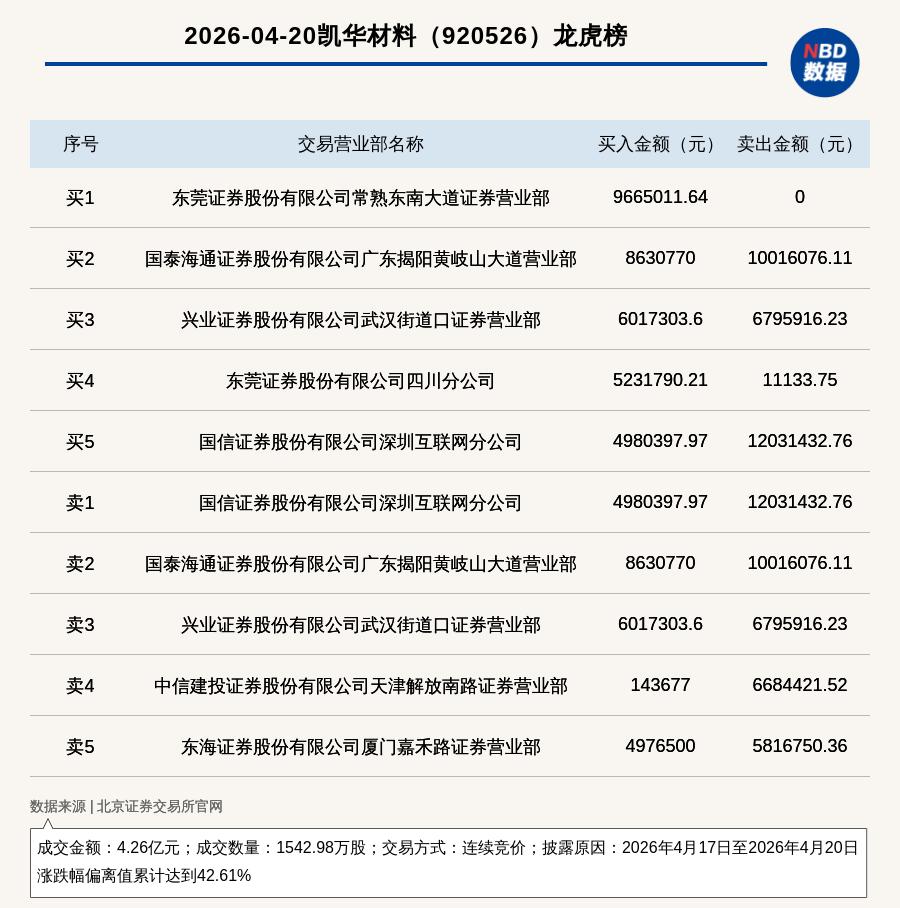 每经讯,2026年4月20日,北交所上市公司凯华材料(920526,收盘价:28.27元)登上龙虎榜,交易方式是连续竞价,披露原因是2026年4月17日至2026年4月20日涨跌幅偏离值累计达到42.61%,成交数量1542.98万股,成交金额4.26亿元。买一席位为东莞证券股份有限公司常熟东南大道证券营业部,买入966.5万元;卖一席位为国信证券股份有限公司深圳互联网分公司,卖出1203.14万元。