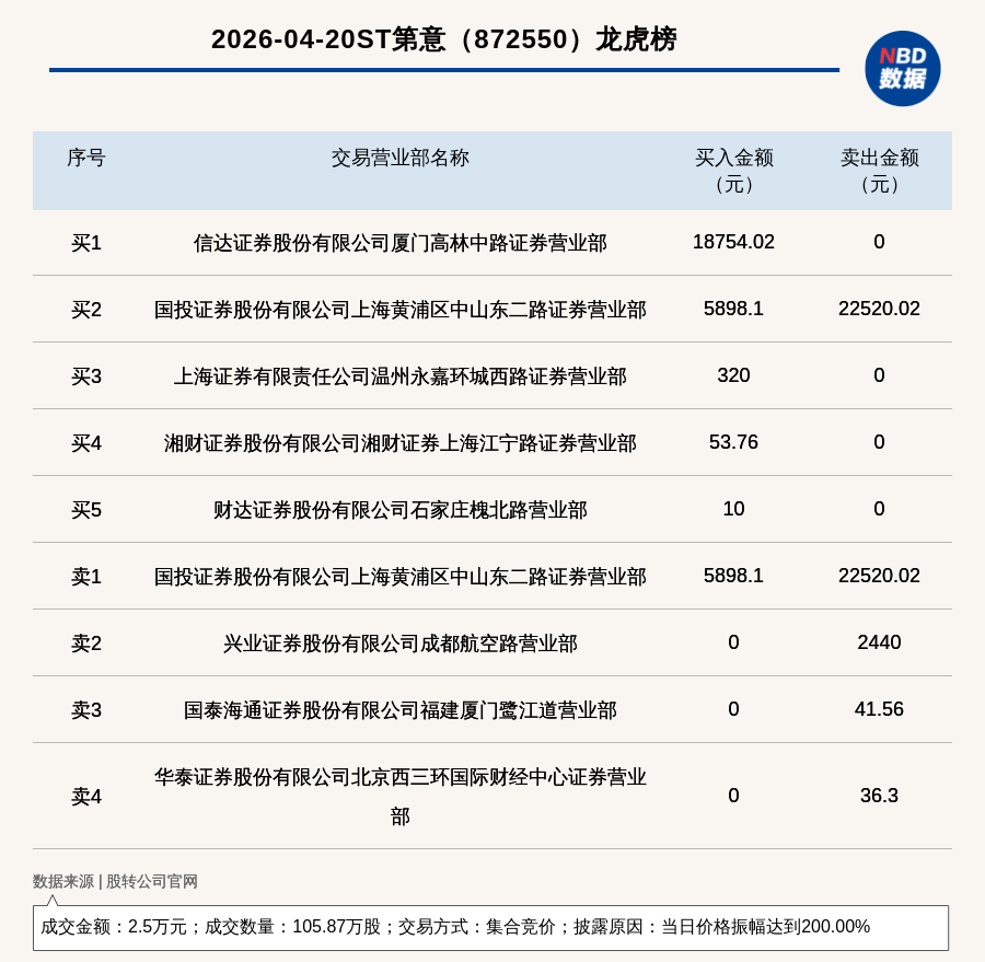 每经讯,2026年4月20日,新三板基础层公司ST第意(872550,收盘价:0.02元)登上龙虎榜,交易方式是集合竞价,披露原因是当日价格振幅达到200.00%,成交数量105.87万股,成交金额2.5万元。买一席位为信达证券股份有限公司厦门高林中路证券营业部,买入1.88万元;卖一席位为国投证券股份有限公司上海黄浦区中山东二路证券营业部,卖出2.25万元。