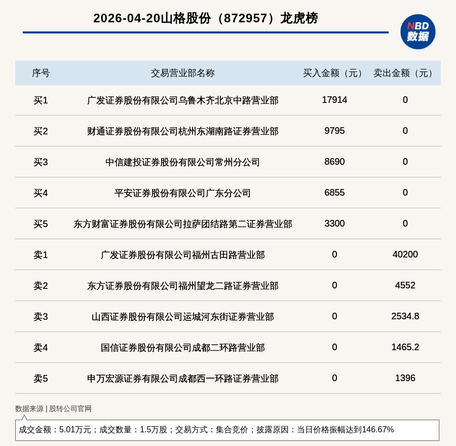 每经讯,2026年4月20日,新三板创新层公司山格股份(872957,收盘价:5.69元)登上龙虎榜,交易方式是集合竞价,披露原因是当日价格振幅达到146.67%,成交数量1.5万股,成交金额5.01万元。买一席位为广发证券股份有限公司乌鲁木齐北京中路营业部,买入1.79万元;卖一席位为广发证券股份有限公司福州古田路营业部,卖出4.02万元。