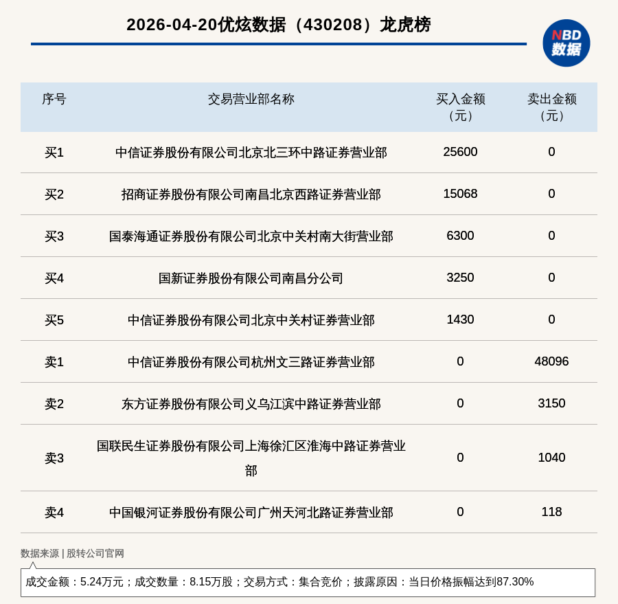 每经讯,2026年4月20日,新三板基础层公司优炫数据(430208,收盘价:0.63元)登上龙虎榜,交易方式是集合竞价,披露原因是当日价格振幅达到87.30%,成交数量8.15万股,成交金额5.24万元。买一席位为中信证券股份有限公司北京北三环中路证券营业部,买入2.56万元;卖一席位为中信证券股份有限公司杭州文三路证券营业部,卖出4.81万元。