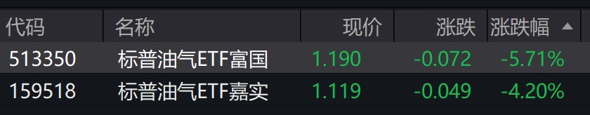 布伦特原油今日小幅走低,受盘面影响,标普油气相关ETF全天弱势,午后跌逾4%。