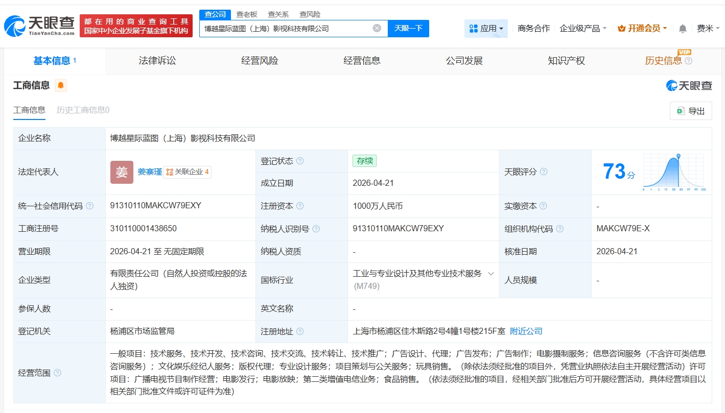 每经AI快讯,天眼查App显示,4月21日,博越星际蓝图(上海)影视科技有限公司成立,法定代表人为姜寨瑾,注册资本1000万元人民币,经营范围包括广告制作、电影摄制服务、版权代理等,由博纳影业(001330)全资持股。
