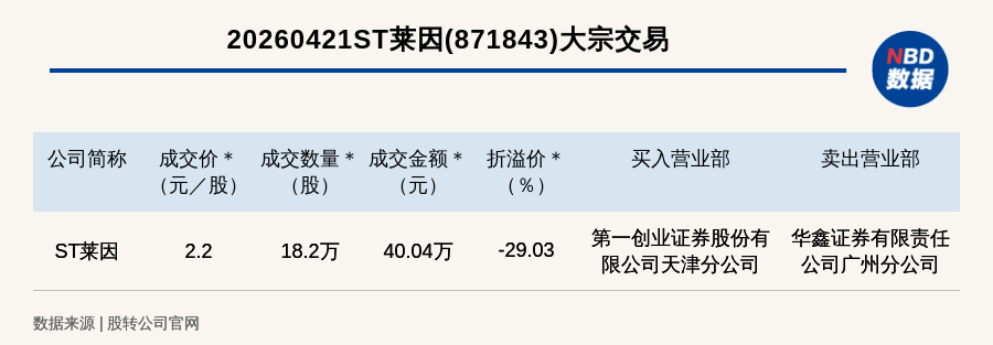 每经讯,2026年4月21日,新三板基础层公司ST莱因(871843,收盘价:3.1元)发生一笔大宗交易,成交价2.2元/股,成交数量18.2万股,成交金额40.04万元,折价29.03%。买入营业部是第一创业证券股份有限公司天津分公司,卖出营业部是华鑫证券有限责任公司广州分公司。