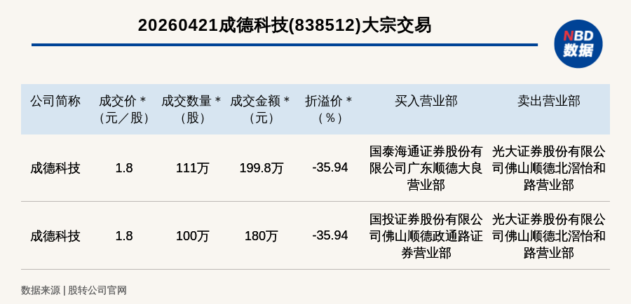 每经讯,2026年4月21日,新三板创新层公司成德科技(838512,收盘价:2.81元)发生2笔大宗交易,总成交金额为379.8万元,成交金额最高的一笔成交价1.8元/股,成交数量111万股,成交金额199.8万元,折价35.94%。买入营业部是国泰海通证券股份有限公司广东顺德大良营业部,卖出营业部是光大证券股份有限公司佛山顺德北滘怡和路营业部。