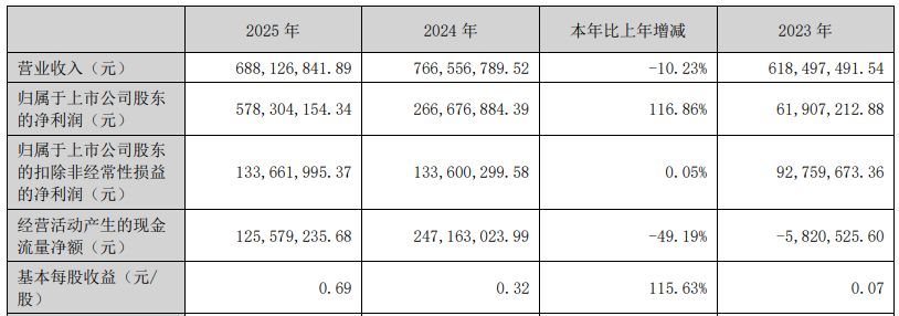 就在3月下旬,新联电子刚发布2025年年报。公司2025年实现营收约6.88亿元,同比下降10.23%,但归属于上市公司股东的净利润却高达5.78亿元,同比大幅增长116.86%。
