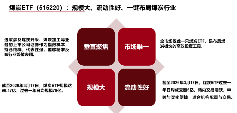 此前对于美伊冲突和印尼煤炭产量配额的过于乐观的预期,其实已经有所消化。而我们的煤炭基本面并不悲观,反而还表现得比较好,所以我们认为在这样的情况之下,回调可能反而是比较好的一个布局时点。展望全年,在这样的情况下,我们觉得煤炭作为我们能源的安全垫、安全压舱石的位置是不会发生动摇的。此外,当前煤炭板块的股息率大约4.8%,在当下低利率的配置背景之下,有非常强的配置价值。因此,我们觉得经历了半个月的回调之后,当下的煤炭ETF(515220)是可以去关注的,左侧布局的投资者也可以开始去考虑分批布局了。