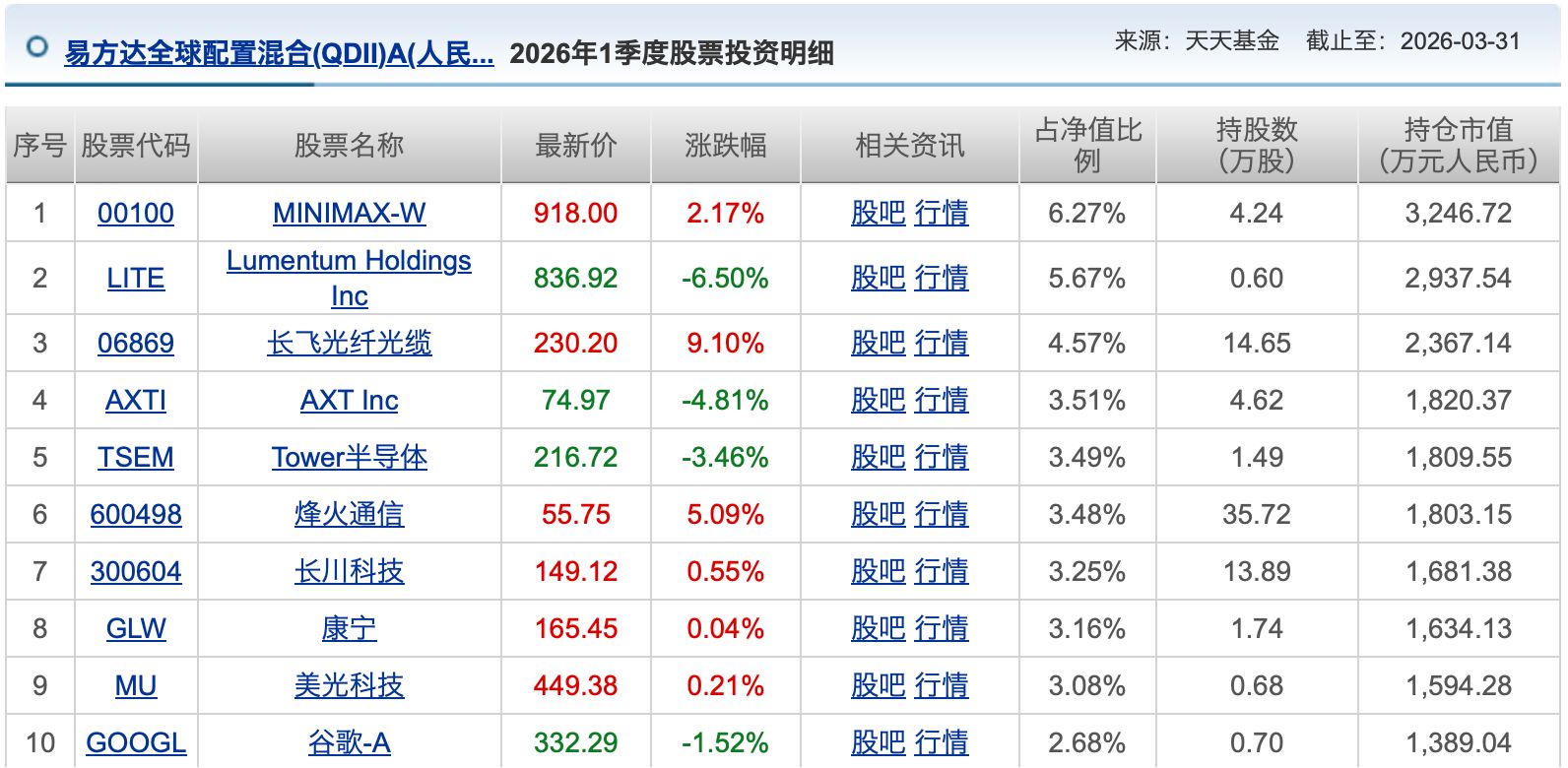 易方达全球配置由知名基金经理张清华管理,截至4月21日,该基金年内收益率36%,位居同类产品第六位。今日(4月22日),该产品公布的一季报显示,截至3月31日,该产品持有Minimax4.24万股,为其第一大重仓股,持仓占比6.27%。此外,该产品还持有港股另一大牛股长飞光纤光缆(HK06869)14.65万股,为第三大重仓股。