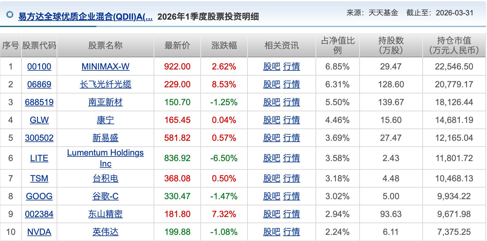 无独有偶,易方达旗下另一只QDII产品易方达全球优质企业混合也将Minimax买成了第一大重仓股。该产品刚刚公布的一季报显示,截至一季度末,持有Minimax29.47万股,持仓占比6.85%,为第一大重仓股。第二大重仓股同样是港股的长飞光纤光缆,持有128万股,持仓占比6.31%。