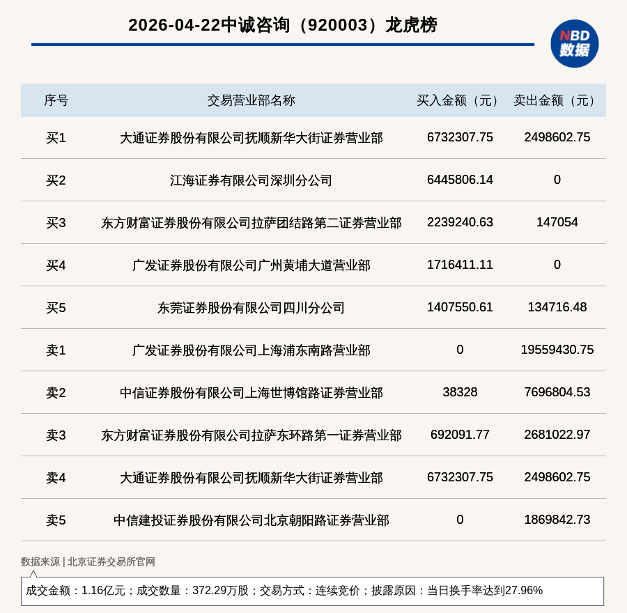 每经讯,2026年4月22日,北交所上市公司中诚咨询(920003,收盘价:31.2元)登上龙虎榜,交易方式是连续竞价,披露原因是当日换手率达到27.96%,成交数量372.29万股,成交金额1.16亿元。买一席位为大通证券股份有限公司抚顺新华大街证券营业部,买入673.23万元;卖一席位为广发证券股份有限公司上海浦东南路营业部,卖出1955.94万元。