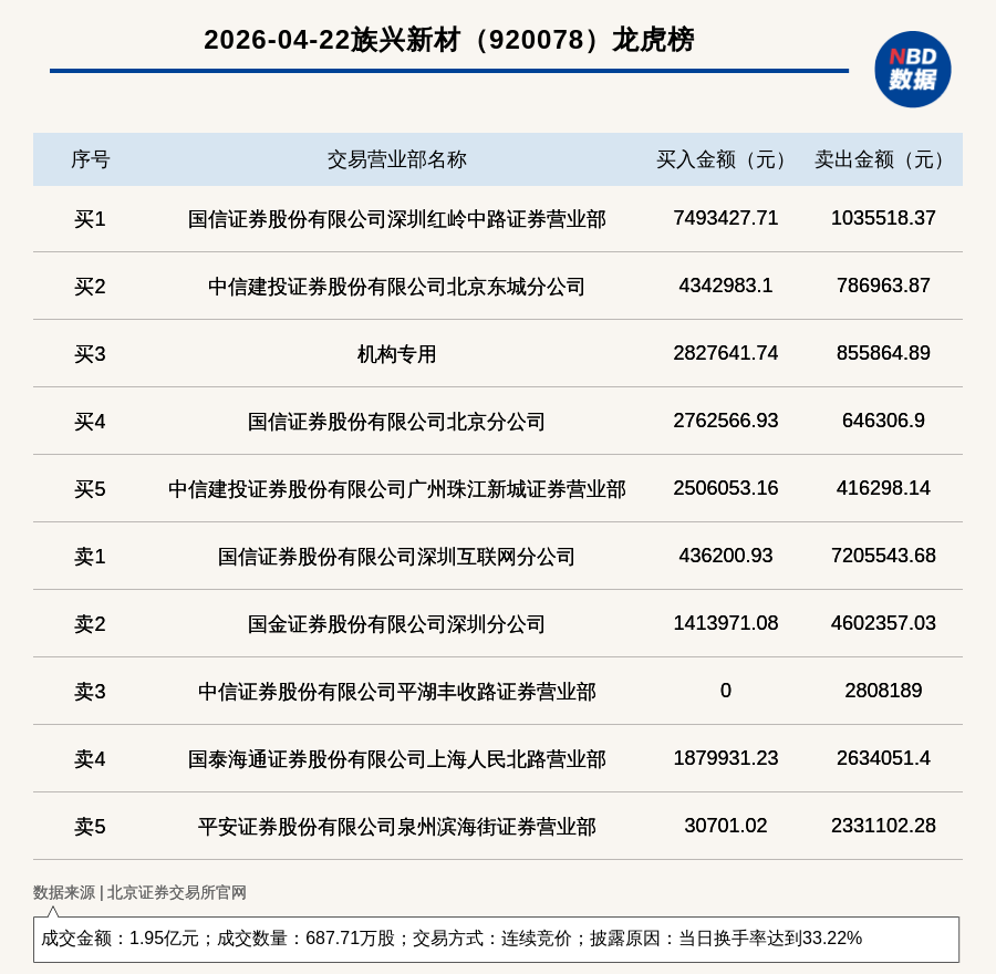 每经讯,2026年4月22日,北交所上市公司族兴新材(920078,收盘价:29.5元)登上龙虎榜,交易方式是连续竞价,披露原因是当日换手率达到33.22%,成交数量687.71万股,成交金额1.95亿元。买一席位为国信证券股份有限公司深圳红岭中路证券营业部,买入749.34万元;卖一席位为国信证券股份有限公司深圳互联网分公司,卖出720.55万元。