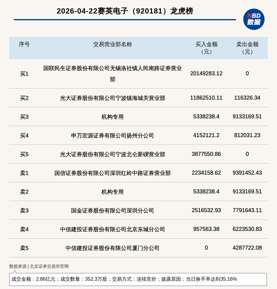 每经讯,2026年4月22日,北交所上市公司赛英电子(920181,收盘价:82.77元)登上龙虎榜,交易方式是连续竞价,披露原因是当日换手率达到35.16%,成交数量352.3万股,成交金额2.86亿元。买一席位为国联民生证券股份有限公司无锡洛社镇人民南路证券营业部,买入2014.93万元;卖一席位为国信证券股份有限公司深圳红岭中路证券营业部,卖出939.15万元。