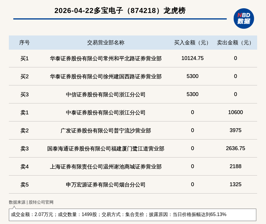 每经讯,2026年4月22日,新三板创新层公司多宝电子(874218,收盘价:21.88元)登上龙虎榜,交易方式是集合竞价,披露原因是当日价格振幅达到65.13%,成交数量1499股,成交金额2.07万元。买一席位为华泰证券股份有限公司常州和平北路证券营业部,买入1.01万元;卖一席位为中泰证券股份有限公司浙江分公司,卖出1.06万元。