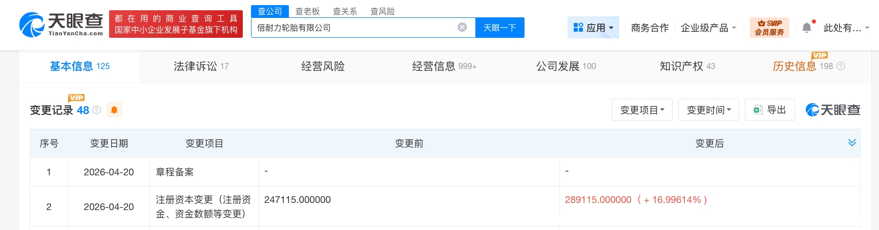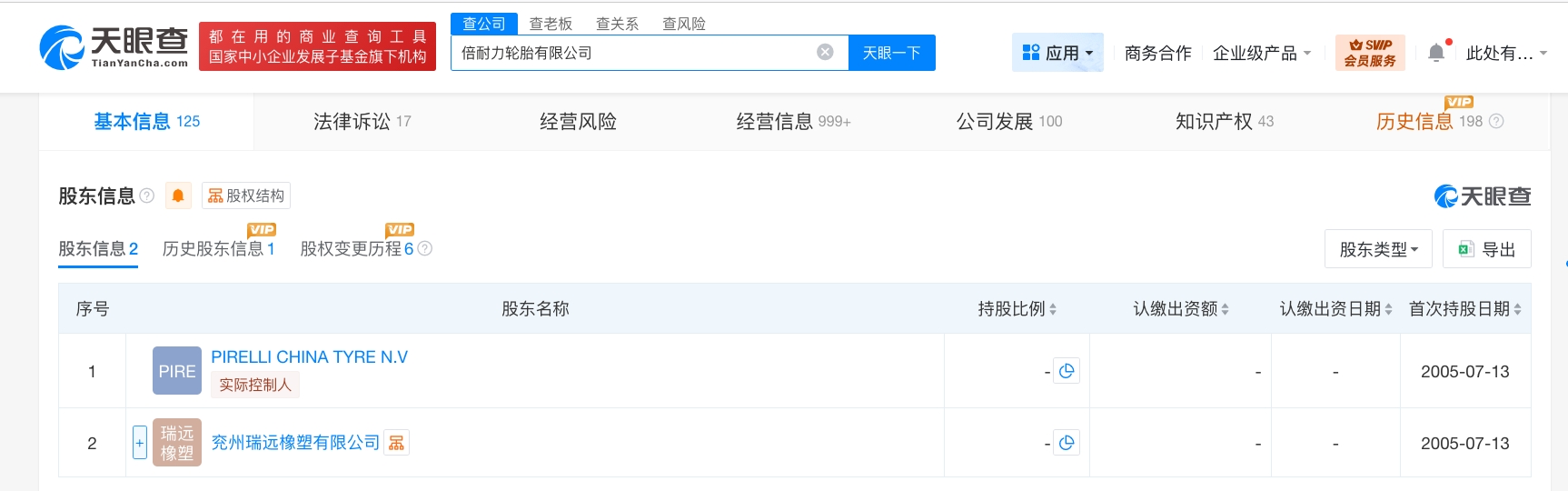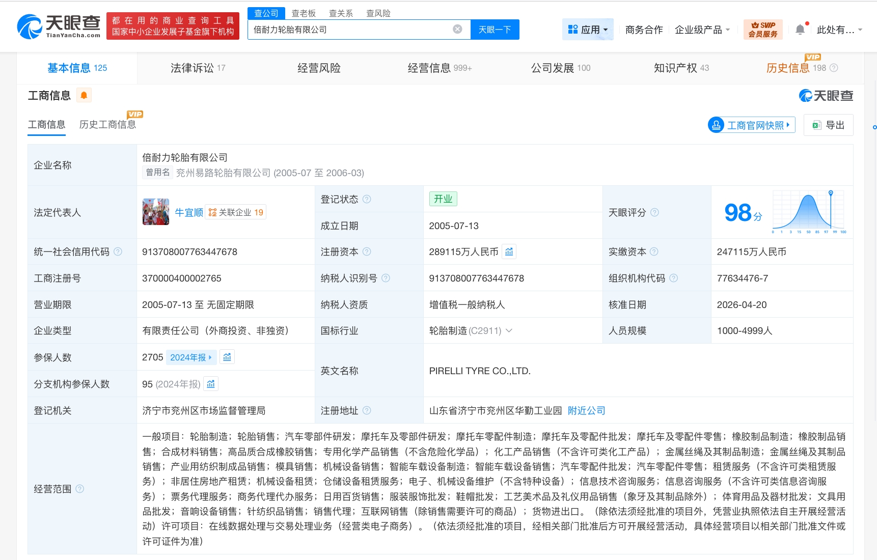 每经AI快讯,天眼查App显示,近日,倍耐力轮胎有限公司发生工商变更,注册资本由约24.7亿元人民币增至约28.9亿元人民币,增幅约17%。该公司成立于2005年7月,法定代表人为牛宜顺,经营范围包括轮胎制造、轮胎销售、汽车零部件研发、摩托车及零部件研发、摩托车零配件制造、橡胶制品制造、橡胶制品销售等。股东信息显示,该公司由PIRELLICHINATYREN.V、兖州瑞远橡塑有限公司共同持股。