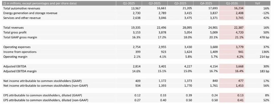 美东时间4月22日盘后,特斯拉发布2026年一季度财报,营收223.87亿美元,同比增长16%,股价盘后先涨后微跌。一季度,特斯拉毛利、现金流等增长,运营费用也增。业务上,汽车交付增长,正推动业务转型,FSD订阅量上升;中国市场交付量增长,智能化有进展。机器人业务方面,工厂筹备中,第三代人形机器人预计年中亮相,市场对其表现看法不一。