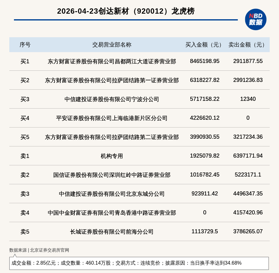 每经讯,2026年4月23日,北交所上市公司创达新材(920012,收盘价:60.18元)登上龙虎榜,交易方式是连续竞价,披露原因是当日换手率达到34.68%,成交数量460.14万股,成交金额2.85亿元。买一席位为东方财富证券股份有限公司昌都两江大道证券营业部,买入846.52万元;卖一席位为机构专用,卖出639.72万元。