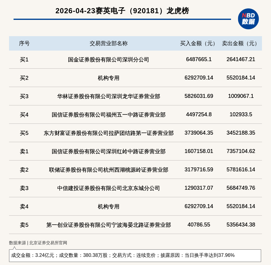 每经讯,2026年4月23日,北交所上市公司赛英电子(920181,收盘价:86.89元)登上龙虎榜,交易方式是连续竞价,披露原因是当日换手率达到37.96%,成交数量380.38万股,成交金额3.24亿元。买一席位为国金证券股份有限公司深圳分公司,买入648.77万元;卖一席位为国信证券股份有限公司深圳红岭中路证券营业部,卖出735.71万元。