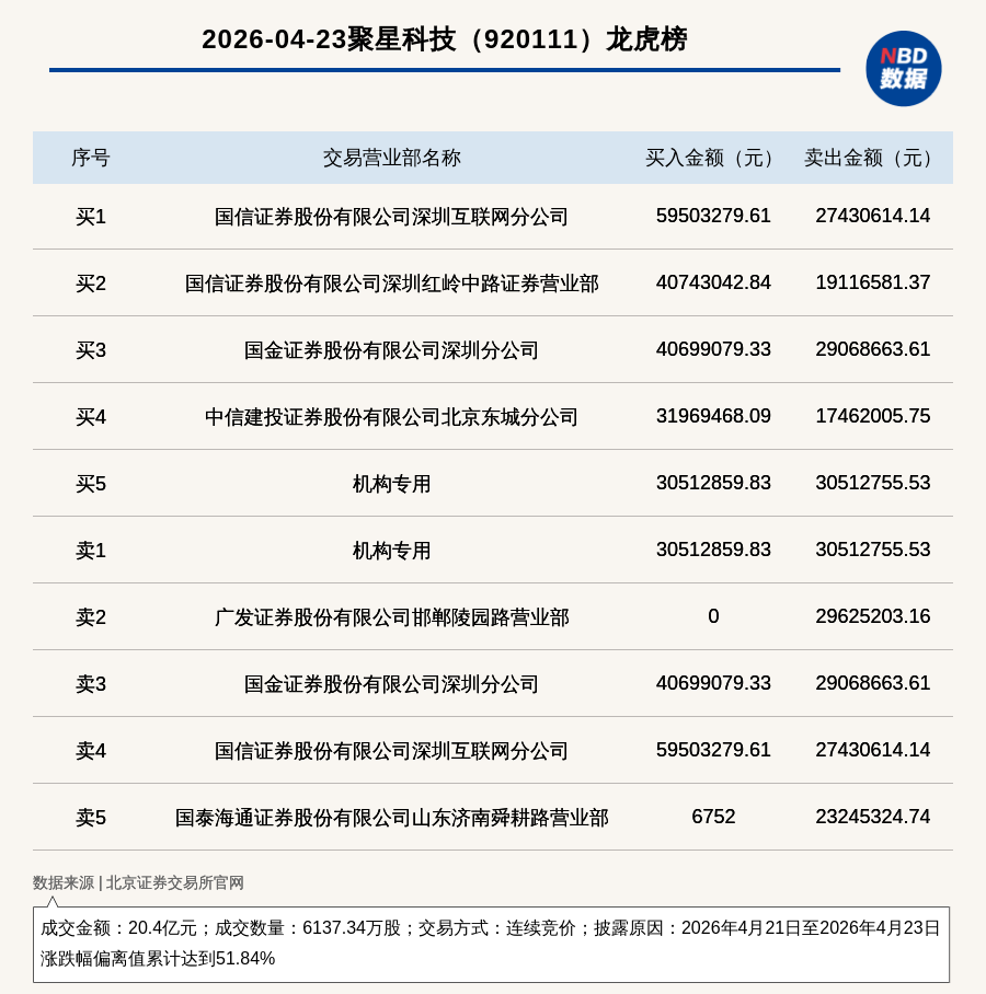 每经讯,2026年4月23日,北交所上市公司聚星科技(920111,收盘价:37.6元)登上龙虎榜,交易方式是连续竞价,披露原因是2026年4月21日至2026年4月23日涨跌幅偏离值累计达到51.84%,成交数量6137.34万股,成交金额20.4亿元。买一席位为国信证券股份有限公司深圳互联网分公司,买入5950.33万元;卖一席位为机构专用,卖出3051.28万元。