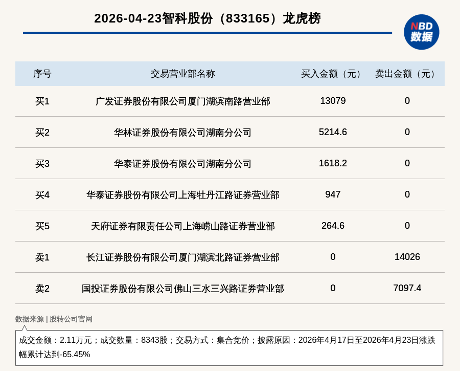 每经讯,2026年4月23日,新三板创新层公司智科股份(833165,收盘价:1.8元)登上龙虎榜,交易方式是集合竞价,披露原因是2026年4月17日至2026年4月23日涨跌幅累计达到-65.45%,成交数量8343股,成交金额2.11万元。买一席位为广发证券股份有限公司厦门湖滨南路营业部,买入1.31万元;卖一席位为长江证券股份有限公司厦门湖滨北路证券营业部,卖出1.4万元。