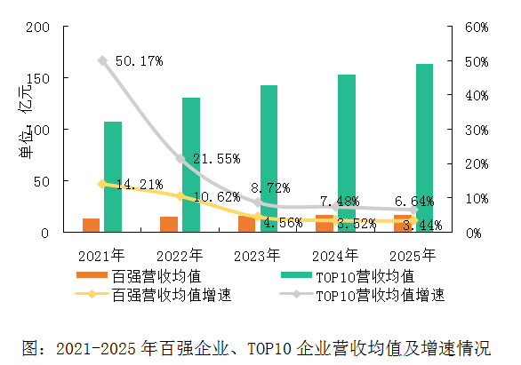 近年来,百强企业营业收入持续增长,增速逐步降低并趋于稳定。2025年,百强企业营收均值为16.60亿元,同比增长3.44%,增速与2024年基本持平。TOP10企业营收均值约为163.25亿元,同比增长6.64%,较百强企业营收增速高3.20个百分点。百强企业与TOP10企业在营收增速上的差距正不断缩小。