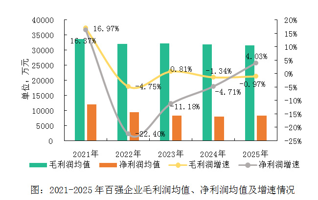 毛利率持续下探,净利率小幅增长。2025年,百强企业毛利率均值为19.02%,较上年下降0.85个百分点;净利率均值为5.01%,较上年微增0.03个百分点。