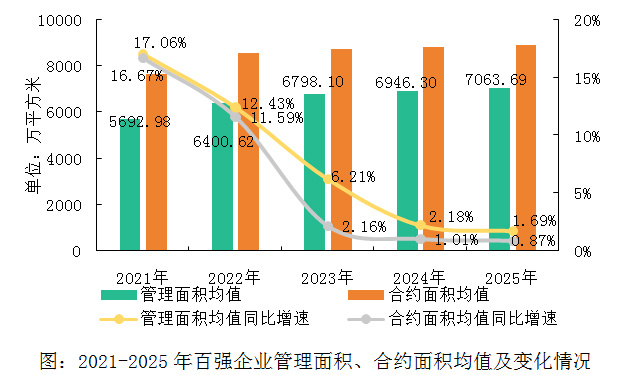 百强企业管理面积虽保持增长态势,但增速进一步放缓并跌破2%。截至2025年底,百强企业管理面积均值为7063.69万平方米,同比增长1.69%,增速较上年下降0.49个百分点;合约面积均值为8924.81万平方米,同比微增0.87%。
